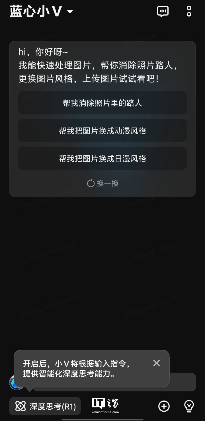 根据用户反馈,接入DeepSeek的蓝心小V支持深度思考(R1):功能开启后,小V将根据输入指令提供智能化深度思考能力。